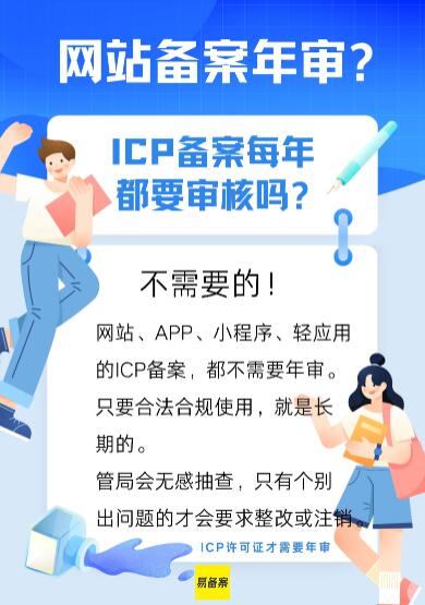 网站、APP、小程序、轻应用的ICP备案,都不需要年审。只要合法合规使用,就是长期的。