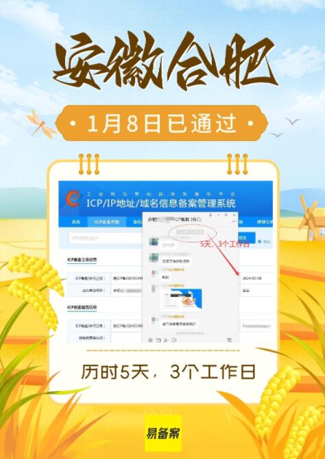 这是我们做的一个客户,5天3个工作日,ICP备案就下来了。安徽省所有的备案都是让安徽管局进行审核的。客户是2024年1月3日提交的,1月8日就通过了管局审核。