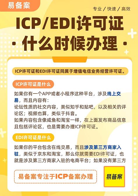 如果你的平台包含在线交易,而且涉及第三方商家入驻,类似于京东和淘宝,那么你就需要EDI许可证,也就是涉及第三方商家入驻的电商平台;如果没有第三方商家入驻,那就属于自营平台,可以不用办理。