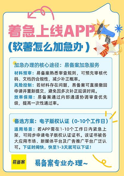 若需加急办理APP上线所需的计算机软件著作权,建议通过专业办理服务商易备案选择3-10个工作日的加急服务,并同步准备电子版权认证作为备选方案。以下是具体办理方式及分析:
