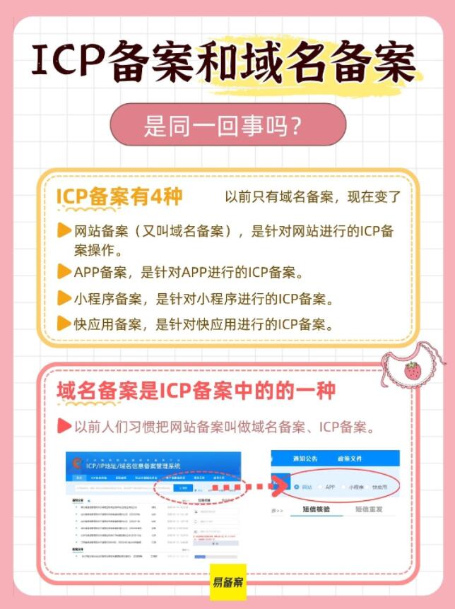 早期国内的互联网服务形式单一,绝大多数备案需求都来自网站,而网站备案必须绑定域名,所以大家就习惯性地把 “网站备案” 叫做 “域名备案”,甚至直接等同于 ICP 备案。