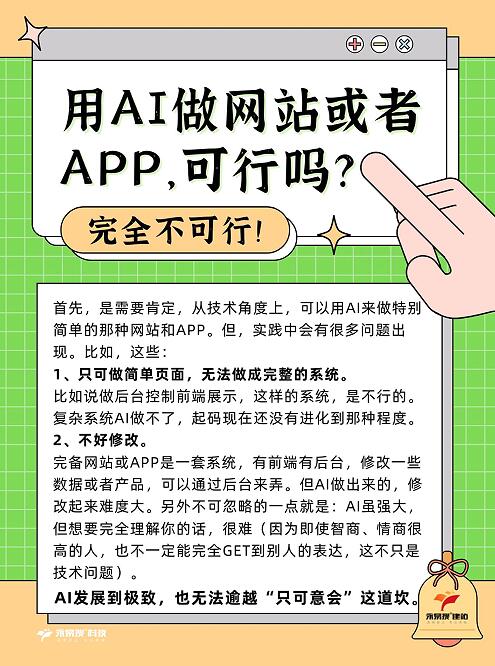完备网站或APP是一套系统,有前端有后台,修改一些数据或者产品,可以通过后台来弄。但AI做出来的,修改起来难度大。另外不可忽略的一点就是:AI虽强大,但想要完全理解你的话,很难(因为即使智商、情商很高的人,也不一定能完全GET到别人的表达,这不只是技术问题)。
