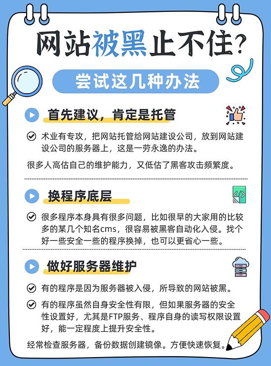 术业有专攻,把网站托管给网站建设公司,放到网站建设公司的服务器上,这是一劳永逸的办法。很多人高估自己的维护能力,又低估了黑客攻击频繁度。