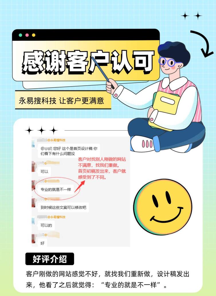 客户对找别人刚做的网站不满意,找我们重做,首页初稿发出来,客户就感受到了不同。说:“专业的就是不一样”。永易搜建站做的网站要从每一个细节都做好。所以,不论是技术角度,还是营销角度,或者设计制作的每一个小细节,都会把控的很好。只有每个细节都做好了,网站才真的好。