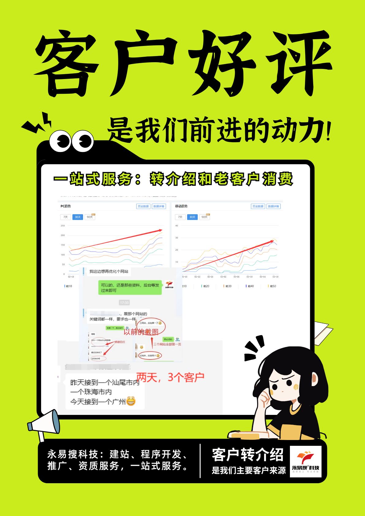 有的客户看到我们做的网站设计,连连称赞,有的客户是网站交付之后觉得服务过程很好。还有的客户是看到最终效果,感到高兴。也有的客户会多次选择我们来做网站,这也是对我们工作的认可。这位客户就是会经常给我们汇报网站推广的额效果。比如这次说:“昨天接到一个汕尾市内,一个珠海市内,今天接到一个广州的”然后是一个笑脸。这也是对我们工作结果的认可。