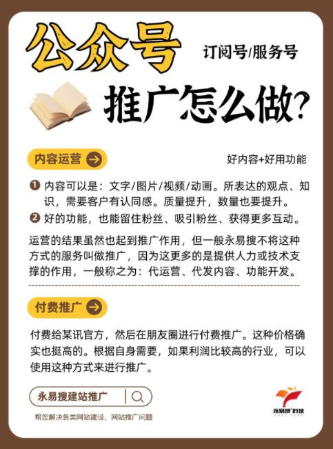 运营的结果虽然也起到推广作用,但一般永易搜不将这种方式的服务叫做推广,因为这更多的是提供人力或技术支撑的作用,一般称之为:代运营、代发内容、功能开发。
