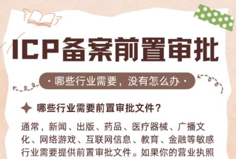 在进行知识付费的课程销售时,ICP备案是必不可少的步骤。然而,许多老师在操作备案时遇到问题,被要求提供前置审批文件。那么,哪些行业需要提供前置审批文件呢?如果没有这些文件,是否就无法进行ICP备案呢?别担心,我们来为你解答这些问题! 1、哪些行业需要前置审批文件? 通常,新闻、出版、药品、医