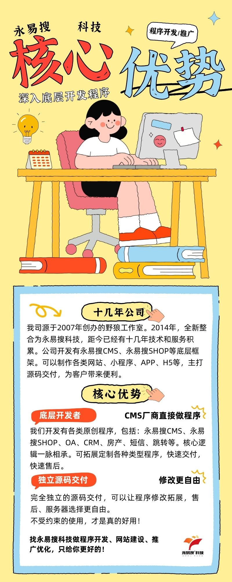 永易搜科技,做网站、小程序、APP,都可以给您更好的服务,更全面的技术支撑。我们作为底层开发者,直接做网站程序给客户,而且还提供独立源码交付,满满的诚意,需要的朋友们赶紧联系永易搜科技了!